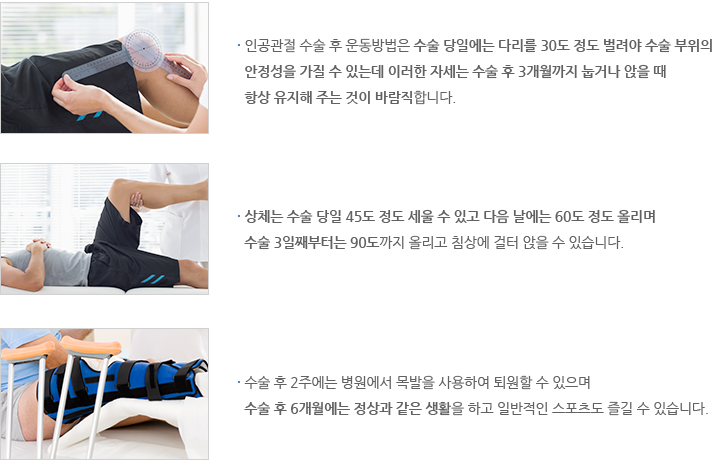 - 대부분은 수술직후 가능한 관절을 빨리 움직이도록 하고 있습니다.