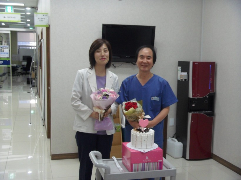 그 주인공은 이**실장님 ,곽**간호과장 인데요, 참석하신 강원장님이하 직원모두 모여 꽃다발 및 케익 중요한 것은 병원장님께서 금일봉을 전달 했습니다. 그 간의 노고를 치하하며,다시한번